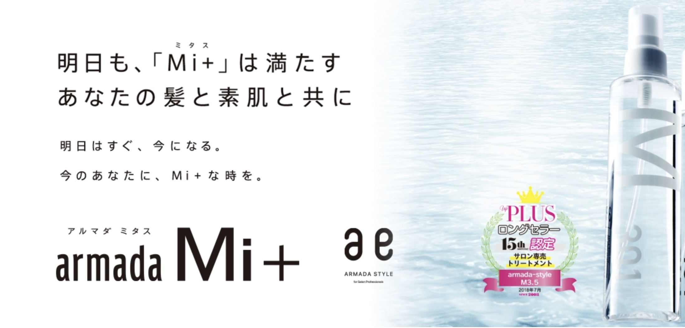 armada Mi+の考え方は「髪の中に元々あるたんぱく質に水分とミネラルを補給して、美しく輝かせる」というもので、従来のアミノ酸系トリートメントのように、髪をコーティングしてツヤと手触りをよくするものではありません。